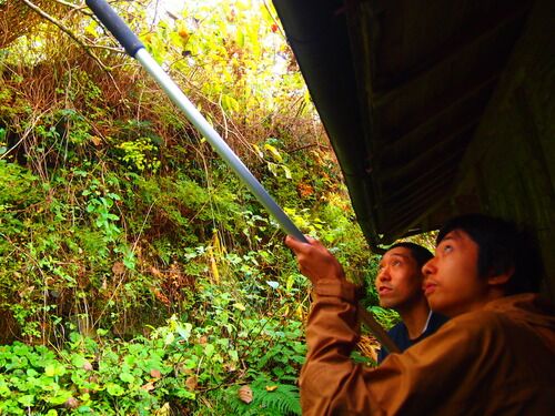 宴会でたらふく酒を飲んだ次の日の朝。 村の人の声で目が覚めた。 何事かと思って起きたら、イノシシが獲れたから見に来ないかと言われた。 宴会で、「もし獲物が獲れたら手伝いに行きます」と言っていたのだ。 まさか言った次の日に獲れるとは。 ↑ 猟犬とジ…